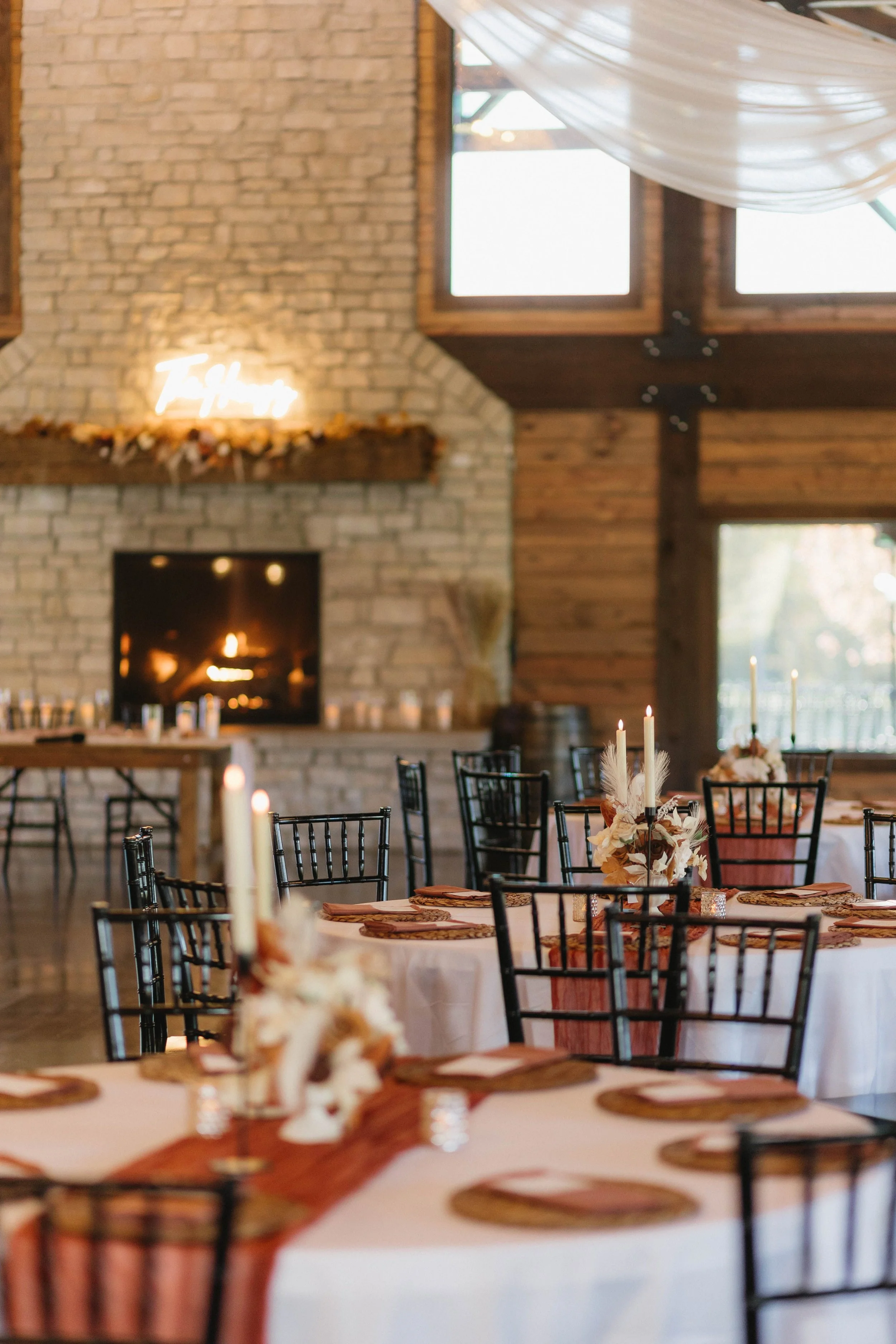 Embrace a Cozy, Intimate Aesthetic: Hanover Reserve’s warm indoor gathering spaces, complete with natural wood and stone accents, are made for a cozy celebration. The venue’s large windows offer stunning views of the late-fall landscape, bringing the beauty of the outdoors in.